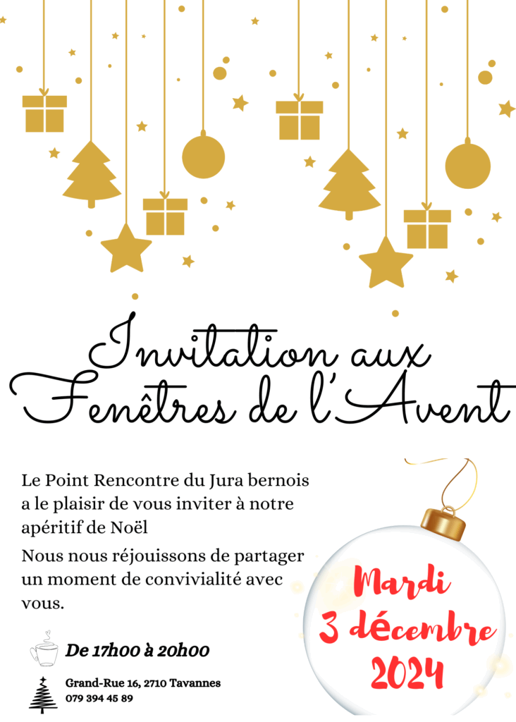 Chaque année, le Point Rencontre participe à l’événement des Fenêtres de l’Avent organisé par la commune de Tavannes. Cette participation s’inscrit dans une volonté de s’ancrer dans la vie locale, de renforcer les liens avec les habitants et de contribuer à des moments fédérateurs et conviviaux. À travers cette initiative, le Point Rencontre affirme son engagement citoyen et sa présence active au cœur de la communauté.